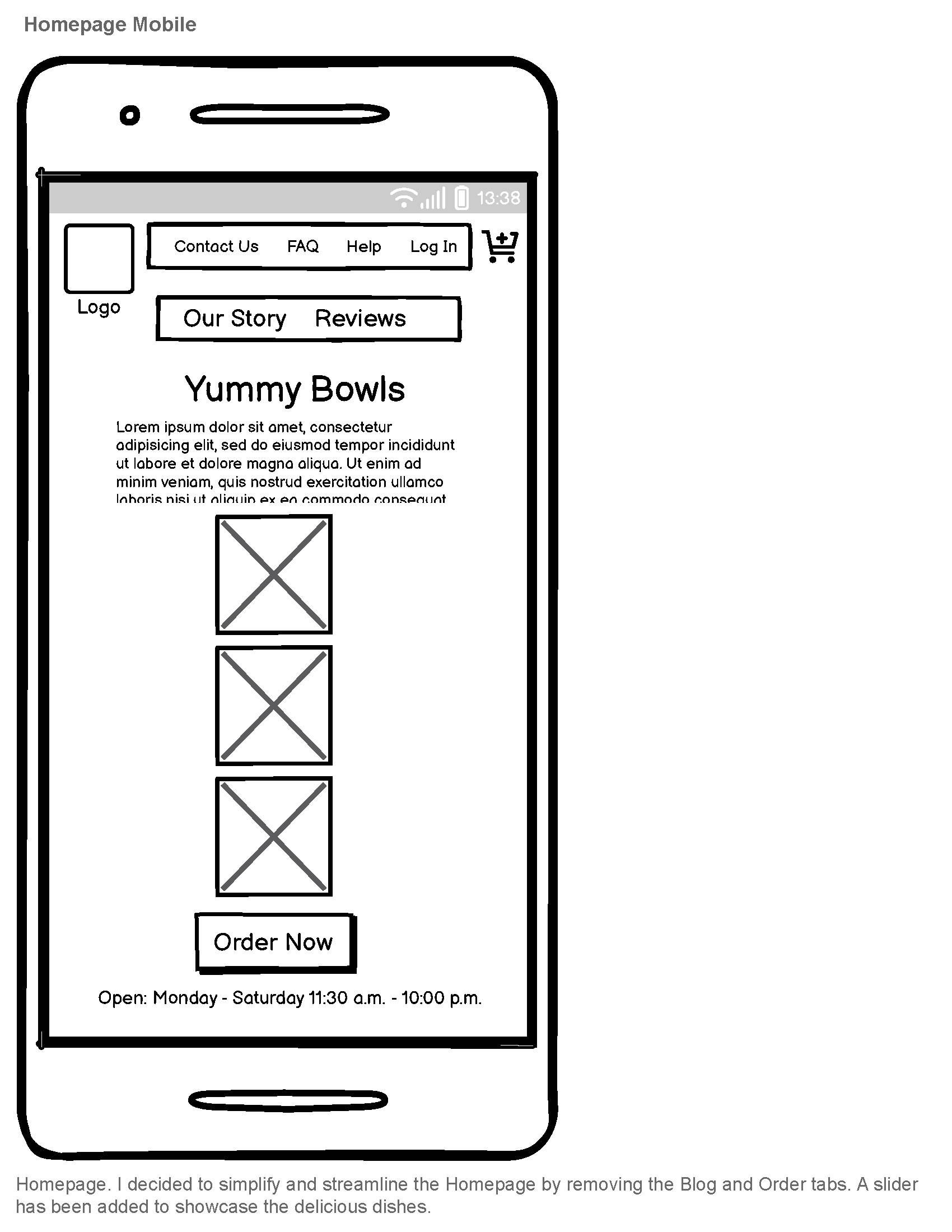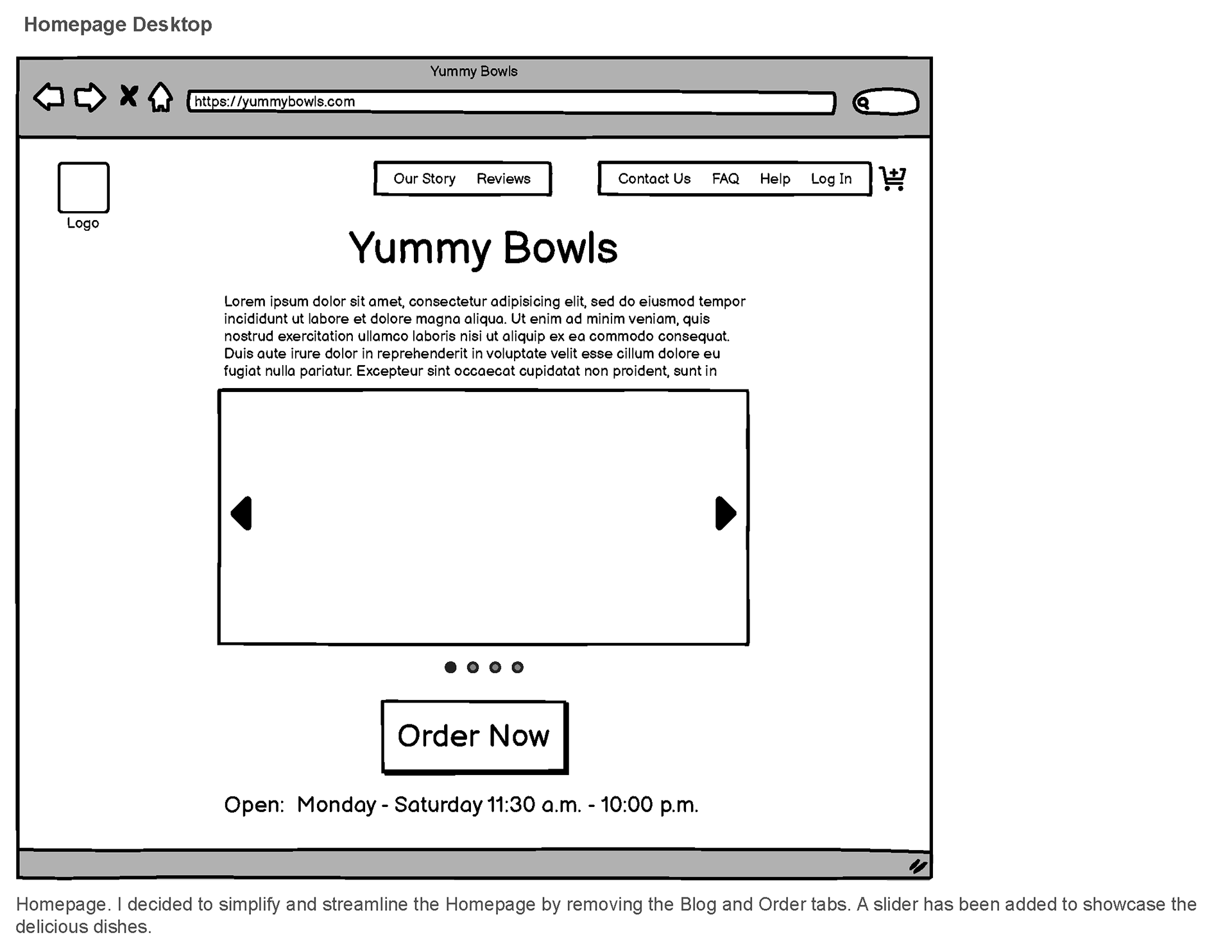 These are wireframes for Yummy Bowls Takeout Restaurant.